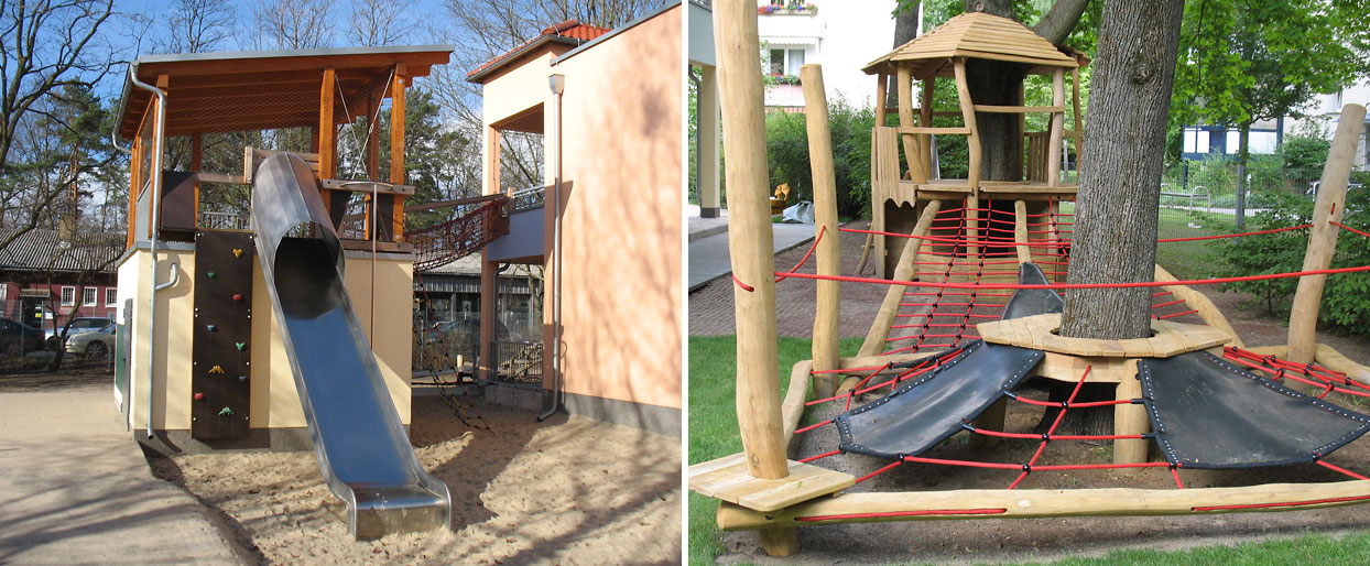 Kletteranbauten zwischen Gartenhaus und Hochbau / Bereich Hort | Baumhaus mit Kletter- und Balancierparcours unter Bäumen, Beachtung des Baumschutzes / Bereich Kindergarten