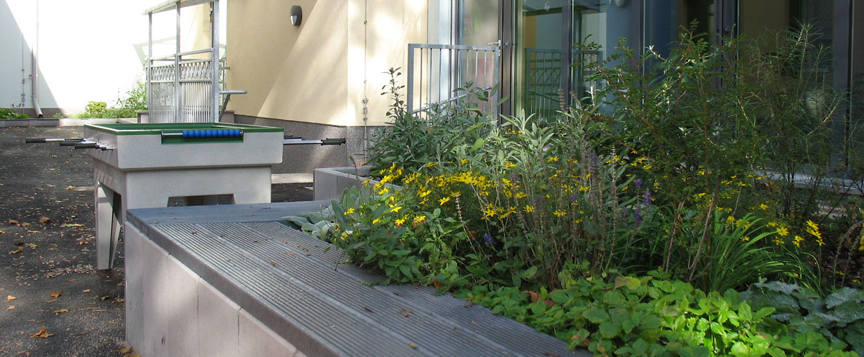 Hochbeet Riechen&Schmecken mit Sitzbank, Tischkicker auf Dränasphalt / Bereich Hort