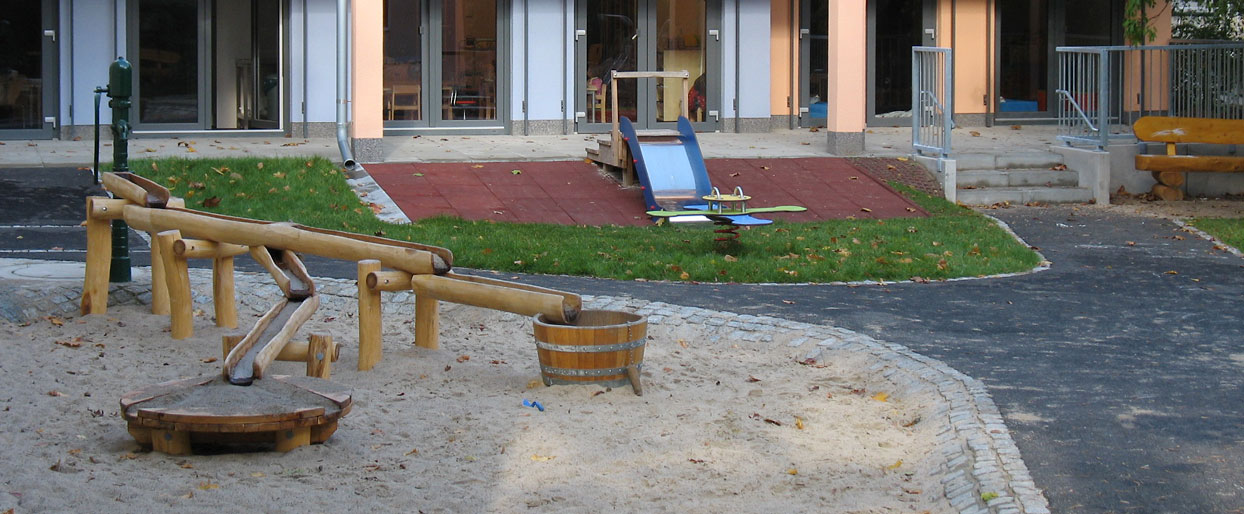 Kleinkinderspielbereich, Matschanlage und Bewegungsspiel, Wege aus Dränasphalt für Vehikel / Bereich Krippe