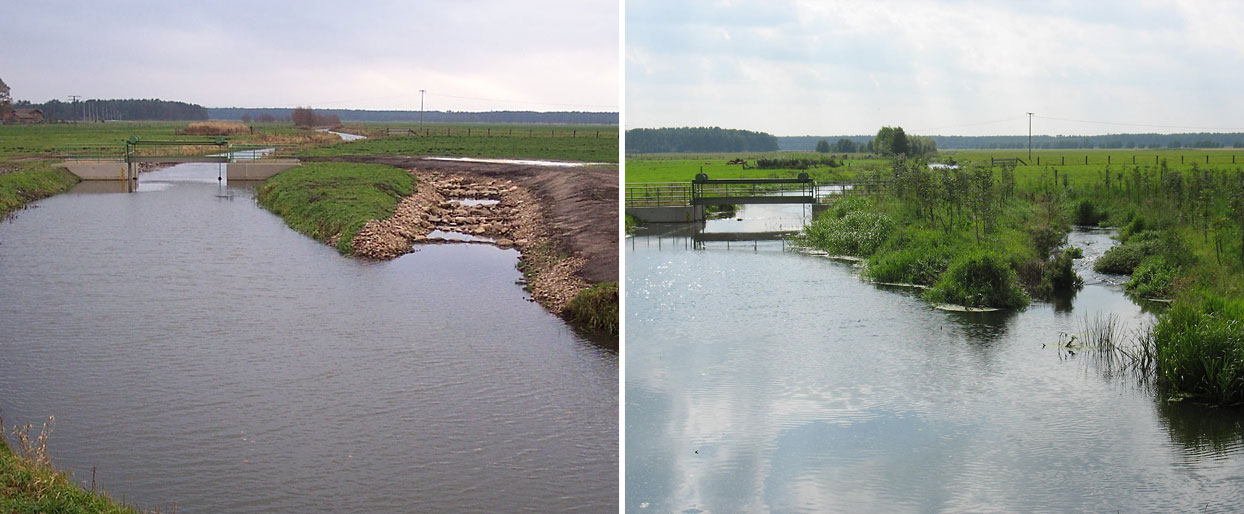 Soll-Ist-Vergleich: Rechtes Ufer mit Trapezprofil des Altbestandes, linkes Ufer nach Renaturierung: Aufweitung, Anlage einer Flachwasserzone und Uferpflanzung mit Bäumen und Sträuchern während der Entwicklungspflege